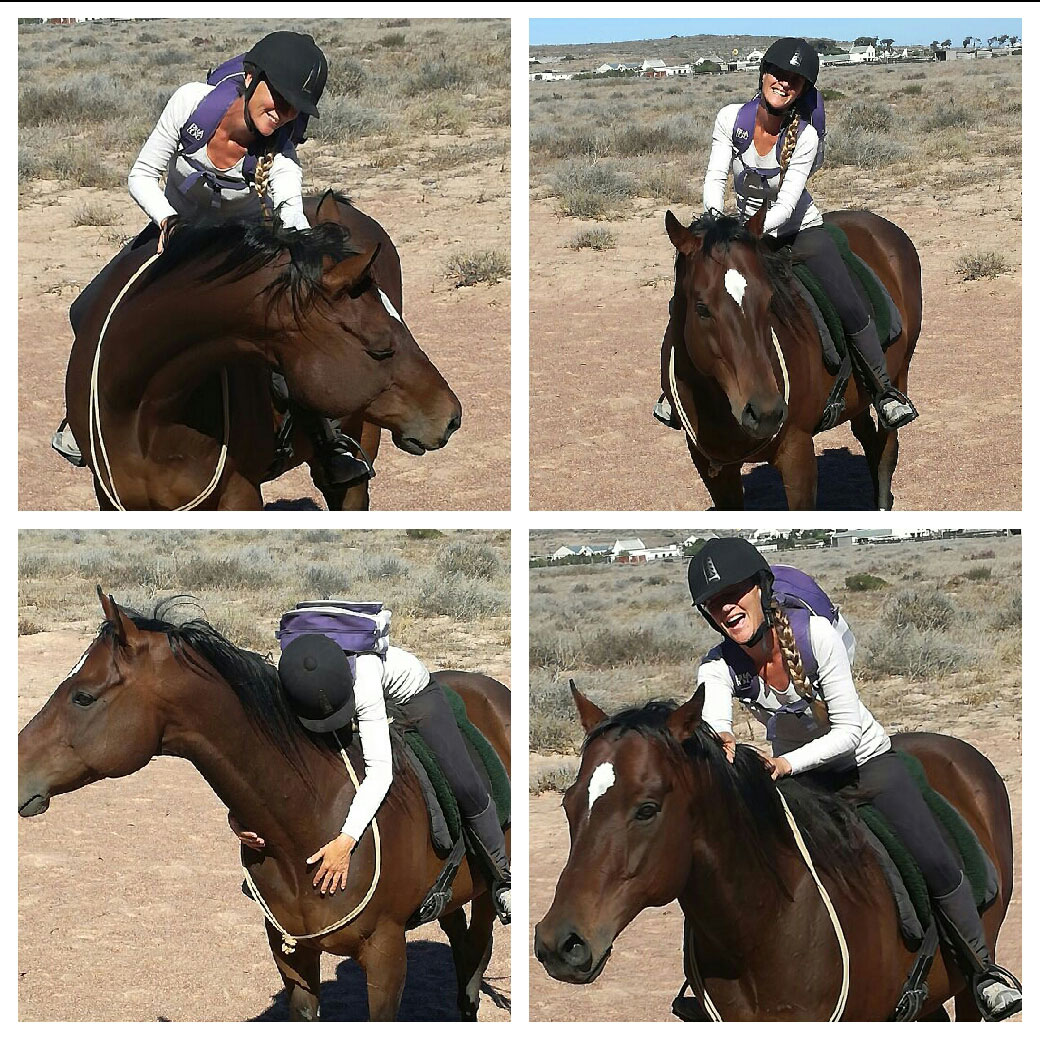 She is adored by Finn too. If he can’t see his Queen, he has a panic attack and they are never very far away from each other. Finn is a thoroughbred and raced for seven years. He is the gentlest of souls. I wasn’t looking for another horse as Queen had another paddock mate at that time. He passed away within three months of Finn coming to live with us. I saw Finn’s photo on the WCET (Western Cape Equine Trust) website and I can’t explain my pull towards him, other than it felt like love at first sight. I put off going to see him as I knew it was crazy to get another horse, but the attraction was too strong. When I arrived at WCET, I could have picked him out of a crowd of a thousand horses. WCET retrains and rehomes thoroughbreds off the track. There is exceptional care taken in retraining and WCET horses are very calm defying the popular belief that all thoroughbreds are dilly. Even so, it was a challenge to separate Finn from his great love Queen when we went out riding together. He is a big, strong horse and in the beginning I was quite intimidated by him. As our relationship grew, I started taking equipment off him, until I was left with my bareback pad and a rope around his neck. With the help of a friend, we trained Finn in the neck rope and that is all we ever went out in, miles away from Queen I might add. I could wax on and on about the magic of the trust and respect riding partnership Finn and I shared. Because of his tough racing career, his joints aren’t great and I made the decision to retire him. It was selfishly, one of the saddest days of my life.