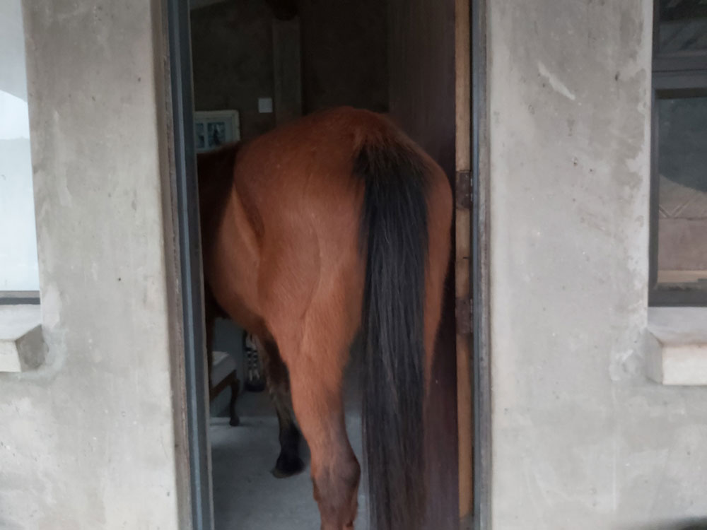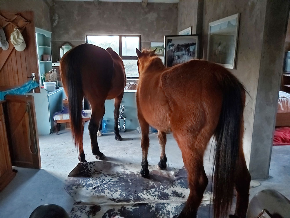 Until the 24th of April. The horses saunter in here as if they have been doing it all their lives. Of course, it takes them all of 2 seconds before they are both in the house. I rearrange some furniture so they can fit comfortably. Swanky isn’t tiled or painted yet and it’s not like I’m getting any visitors any time soon. It may as well be them!